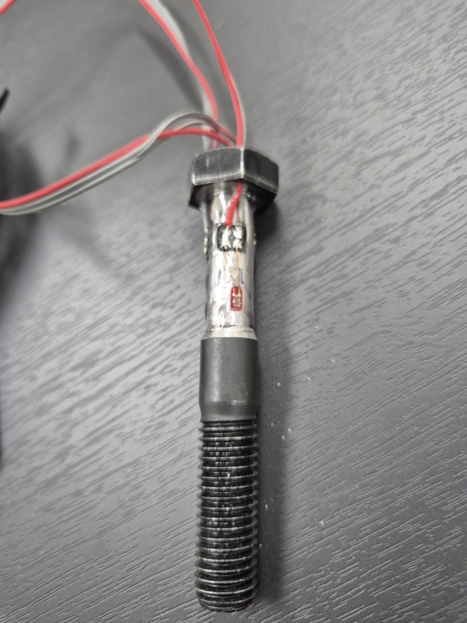 Quarter Bridge 스트레인게이지 3개를 이용하여 볼트 수직 방향으로 부착을 하여 볼트 체결 후 인장, 압축력을 측정할 수 있는 센서로 제작, 공급을 하였습니다.