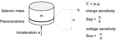 가속도계가 진동을 받으면 압전 소자에 작용하는 힘이 생성됩니다 (그림 참조).
