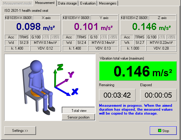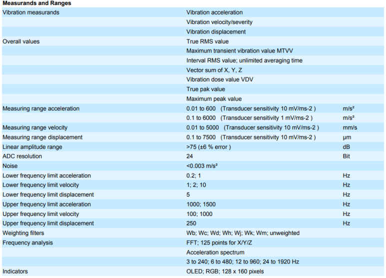 - 간격 및 실행 RMS, 최대 RMS(MTVV), 진동 선량 값(VDV), 벡터 합, 피크 및 최대 피크